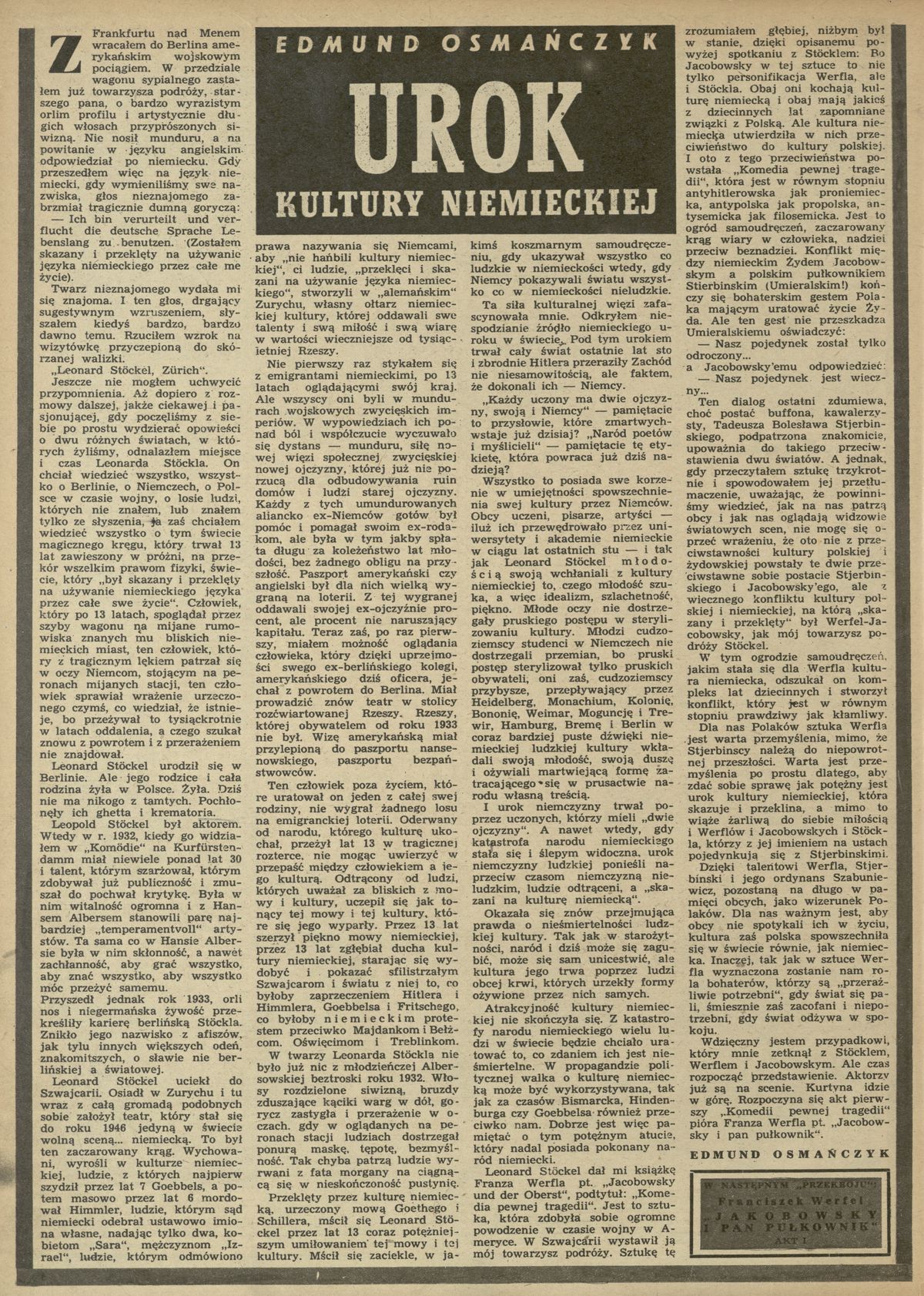 Archiwum / Kultura nr 107 (17/1947) 240/10538 Podziel się Tytuł Urok kultury niemieckiej Autor Edmund Osmańczyk Kategoria Kultura Artykuł z numeru 107 (17/1947) Data wydania 27 kwietnia 1947 Tagi kultura Niemcy