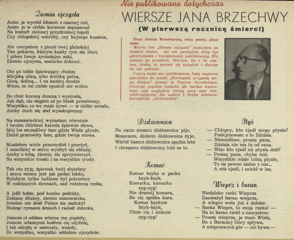 Archiwum / Poezja nr 1160 (27/1967) 1/4 Podziel się Tytuł Niepublikowane dotąd wiersze Jana Brzechwy: Ziemia ojczysta, Dżdżownica, Komar, Ptyś, Wieprz i baran Autor Jan Brzechwa Kategoria Poezja Artykuł z numeru 1160 (27/1967) Data wydania 2 lipca 1967 Tagi wiersz