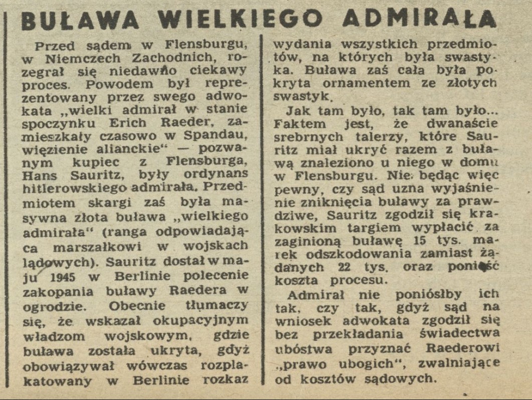 Archiwum / Różności nr 533 (26/1955) 2/9 Podziel się Tytuł Buława wielkiego admirała Kategoria Różności Artykuł z numeru 533 (26/1955) Data wydania 26 czerwca 1955 Tagi prawo sąd Berlin