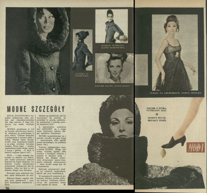 Archiwum / Moda nr 912 (39/1962) 16/40 Podziel się Tytuł Modne szczgóły Autor Barbara Hoff Rubryka Moda Artykuł z numeru 912 (39/1962) Data wydania 30 września 1962 Tagi moda damska dodatki czapka moda zimowa