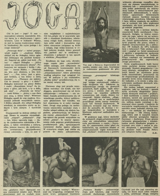 Archiwum / Artykuł nr 529 (22/1955) 103909/123969 Podziel się Tytuł Joga Autor A.D. Kategoria Artykuł Artykuł z numeru 529 (22/1955) Data wydania 29 maja 1955 Tagi Indie ćwiczenia asana