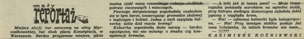Archiwum / Mały reportaż nr 597 (38/1956) 06/16 Podziel się Tytuł Mały reportaż Autor Kazimierz Koźniewski Rubryka Mały reportaż Artykuł z numeru 597 (38/1956) Data wydania 16 września 1956 Tagi bar owocowy ul. Marszałkowska Warszawa