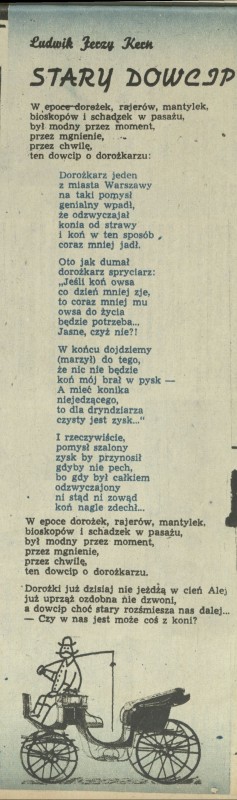 Archiwum / Rozmaitości [old] nr 597 (38/1956) 70/239 Podziel się Tytuł Stary dowcip Autor Ludwik Jerzy Kern Rubryka Rozmaitości [old] Artykuł z numeru 597 (38/1956) Data wydania 16 września 1956 Tagi dorożkarz Warszawa dorożka wiersz