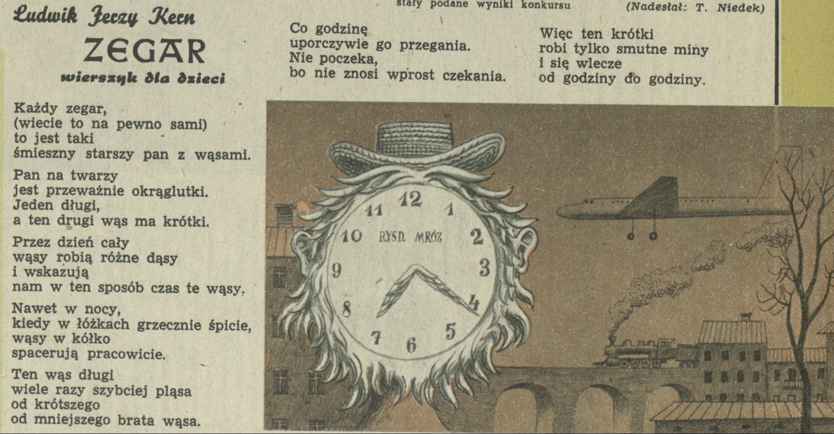 Archiwum / Poezja nr 592 (33/1956) 23008/123969 Podziel się Tytuł Zegar (wierszyk dla dzieci) Autor Ludwik Jerzy Kern Daniel Mróz Kategoria Poezja Artykuł z numeru 592 (33/1956) Data wydania 12 sierpnia 1956