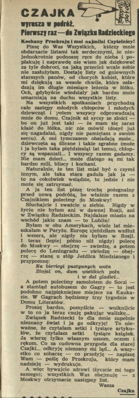 Archiwum / Listy do i od redakcji nr 1160 (27/1967) 21/23 Podziel się Tytuł Czajka wyrusza w podróż. Autor Izabela "Czajka" Stachowicz Rubryka Listy do i od redakcji Artykuł z numeru 1160 (27/1967) Data wydania 2 lipca 1967 Tagi ZSRR
