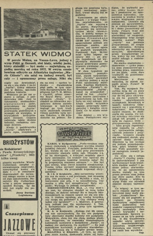 Archiwum / Artykuł nr 567 (08/1956) 21811/123969 Podziel się Tytuł Statek widmo Autor Top. Kategoria Artykuł Artykuł z numeru 567 (8/1956) Data wydania 19 lutego 1956 Tagi Malau Vanua-Levu Fidżi Oceania Mary Celeste załoga zagadka statek
