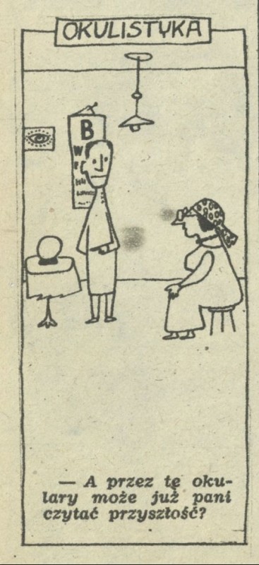 Archiwum / Historyjki obrazkowe nr 603 (44/1956) 23533/123969 Podziel się Tytuł Okulistyka Autor Marian Eile Kategoria Historyjki obrazkowe Artykuł z numeru 603 (44/1956) Data wydania 28 października 1956 Tagi żart rysunkowy wróżka okulary przyszłość