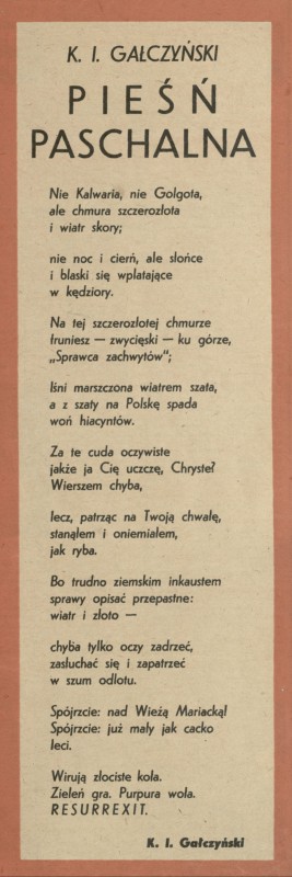 Archiwum / Poezja nr 154-55 (12-13/1948) 5/8 Podziel się Tytuł Pieśń paschalna Autor Konstanty Ildefons Gałczyński Kategoria Poezja Artykuł z numeru 154-55 (12/1948) Data wydania 27 marca 1948