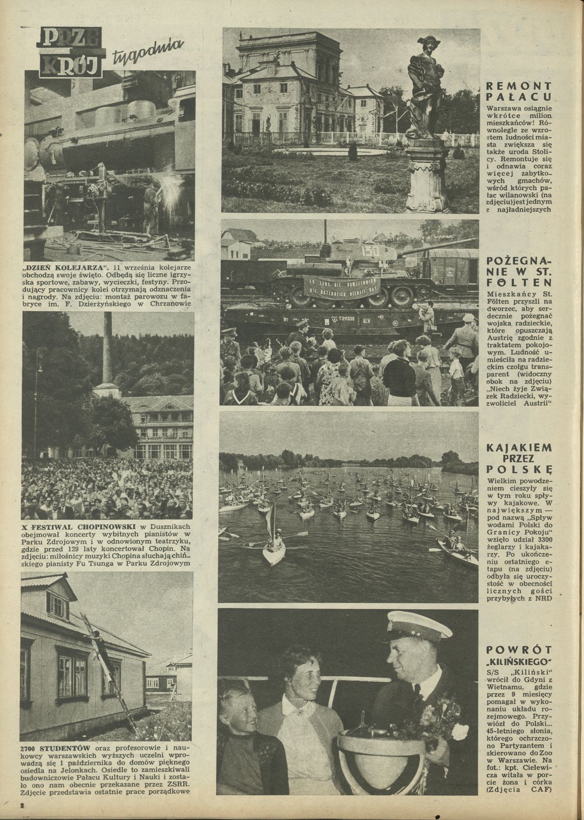 Archiwum / Przekrój tygodnia nr 544 (37/1955) 18/31 Podziel się Tytuł Przekrój tygodnia Rubryka Przekrój tygodnia Artykuł z numeru 544 (37/1955) Data wydania 11 września 1955 Tagi Dzień Kolejarza Festiwal Chopinowski Remont Pałacu Pożegnanie w St. Folten Kajakiem przez Polskę Powrót "Kilińskiego"
