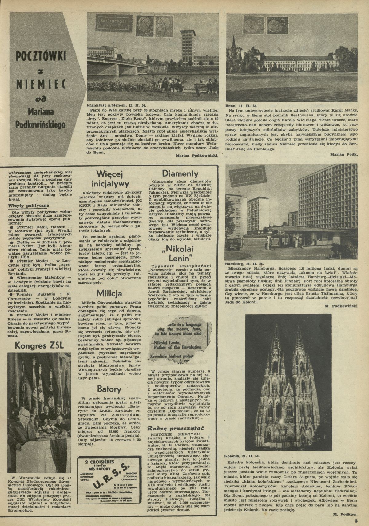 Archiwum / korespondencja własna "Przekroju" nr 571 (12/1956) 76/266 Podziel się Tytuł Pocztówki z Niemiec Autor Marian Podkowiński Rubryka korespondencja własna "Przekroju" Artykuł z numeru 571 (12/1956) Data wydania 18 marca 1956 Tagi Kolonia Bonn Hamburg Frankfurt