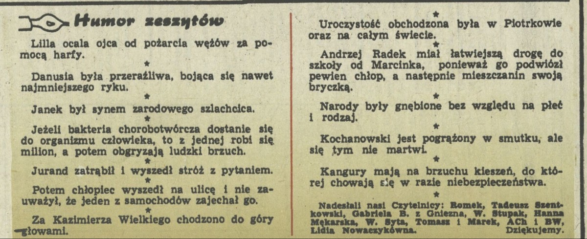 Archiwum / Humor zeszytów szkolnych nr 1058 (29/1965) 44402/123969 Podziel się Tytuł Humor zeszytów Rubryka Humor zeszytów szkolnych Artykuł z numeru 1058 (29/1965) Data wydania 22 lipca 1965