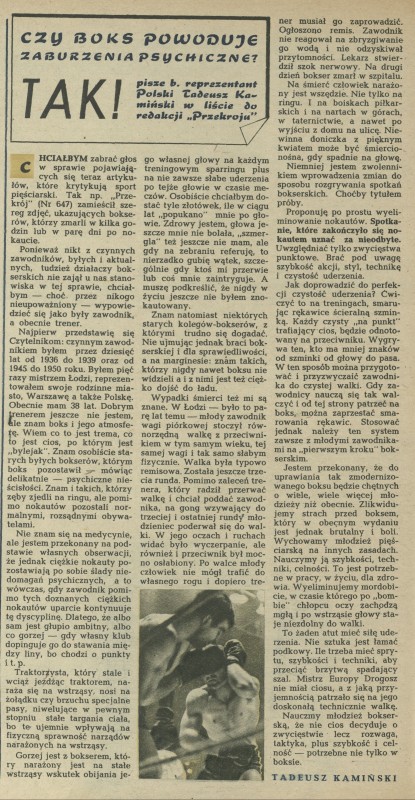 Archiwum / Sport nr 653 (42/1957) 924/1805 Podziel się Tytuł Czy boks powoduje zaburzenia psychiczne? TAK! Autor Tadeusz Kamiński Rubryka Sport Artykuł z numeru 653 (42/1957) Data wydania 13 października 1957 Tagi medycyna sport