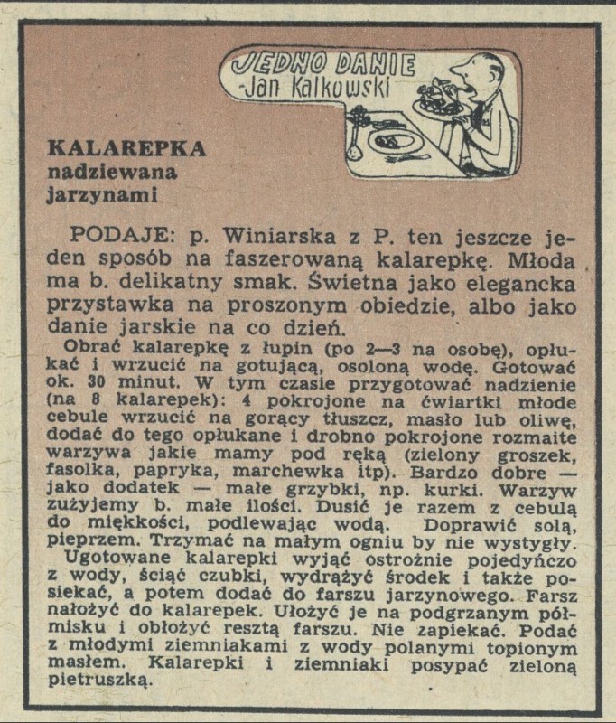 Archiwum / Jedno danie nr 1162 (29/1967) 28/50 Podziel się Tytuł Kalarepka nadziewana jarzynami Autor Jan Kalkowski Rubryka Jedno danie Artykuł z numeru 1162 (29/1967) Data wydania 16 lipca 1967 Tagi gastronomia kulinaria przepis kulinarny kuchnia wegetariańska kalarepa