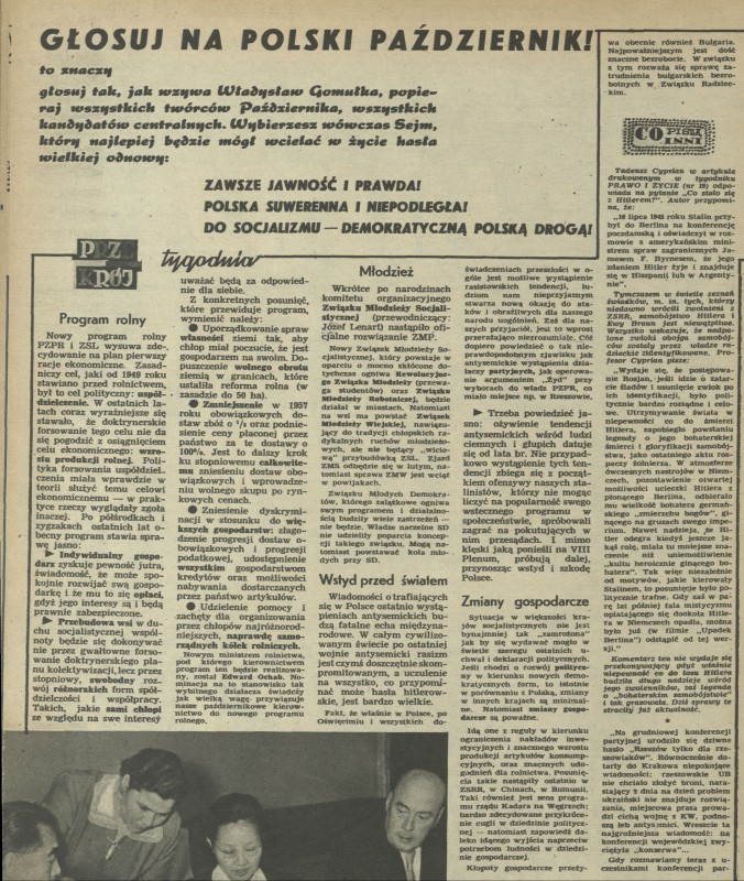 Archiwum / Przekrój tygodnia nr 615 (04/1957) 25/33 Podziel się Tytuł Przekrój tygodnia Rubryka Przekrój tygodnia Artykuł z numeru 615 (4/1957) Data wydania 20 stycznia 1957 Tagi sejm wybory Gomułka socjalizm program rolny PZPR ZSL młodzież antysemityzm gospodarka