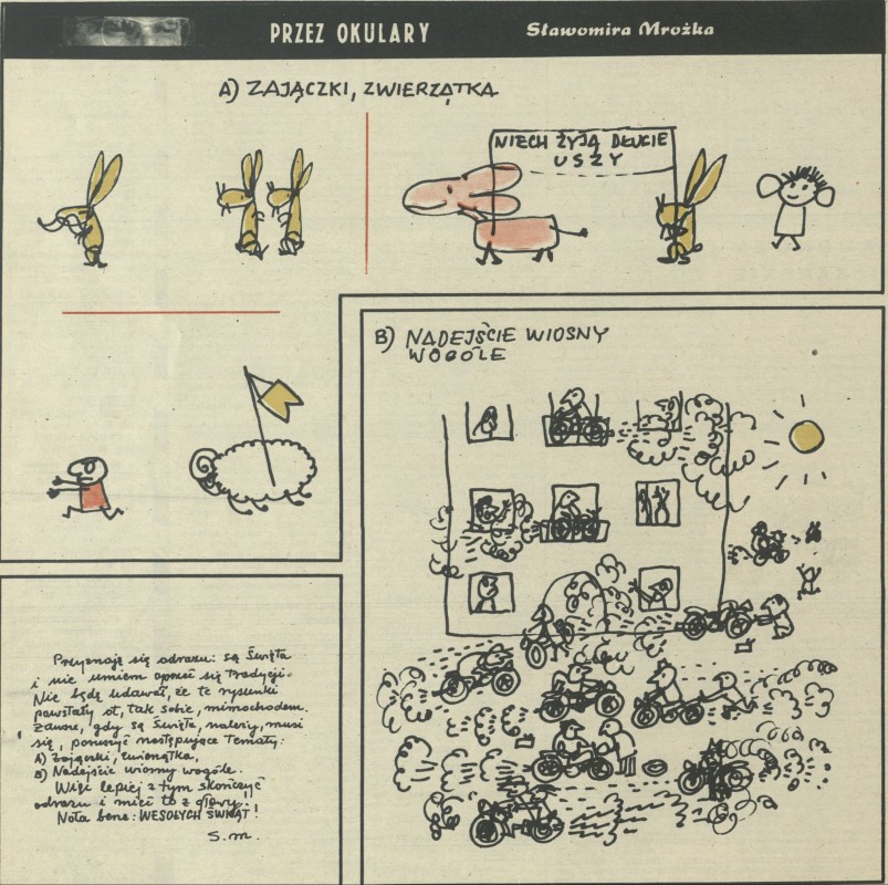 Archiwum / Przez okulary Sławomira Mrożka nr 939-40 (14-15/1963) 260/373 Podziel się Tytuł Przez okulary Sławomira Mrożka Autor Sławomir Mrożek Rubryka Przez okulary Sławomira Mrożka Artykuł z numeru 939-40 (14/1963) Prawa Diogenes Verlag AG Data wydania 14 kwietnia 1963 Tagi satyra absurd żart rysunkowy Wielkanoc zając baranek wiosna motocykle
