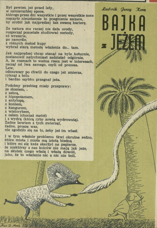 Archiwum / Rozmaitości [old] nr 505 (50/1954) 68/188 Podziel się Tytuł Bajka z jeżem Autor Ludwik Jerzy Kern Daniel Mróz Rubryka Rozmaitości [old] Artykuł z numeru 505 (50/1954) Data wydania 5 grudnia 1954