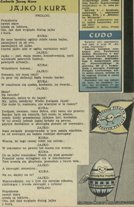 Archiwum / Rozmaitości [old] nr 521-22 (14-15/1955) 19/68 Podziel się Tytuł Jajko i kura Autor Ludwik Jerzy Kern Rubryka Rozmaitości [old] Artykuł z numeru 521-22 (14/1955) Data wydania 3 kwietnia 1955 Tagi pisanka