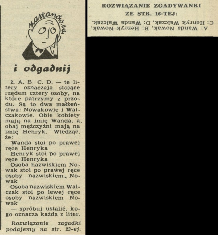 Archiwum / Zastanów się nr 365-66 (14-15/1952) 39/269 Podziel się Tytuł Zastanów się i odgadnij Rubryka Zastanów się Artykuł z numeru 365-66 (14/1952) Data wydania 6 kwietnia 1952 Tagi zagadka zgadywanka