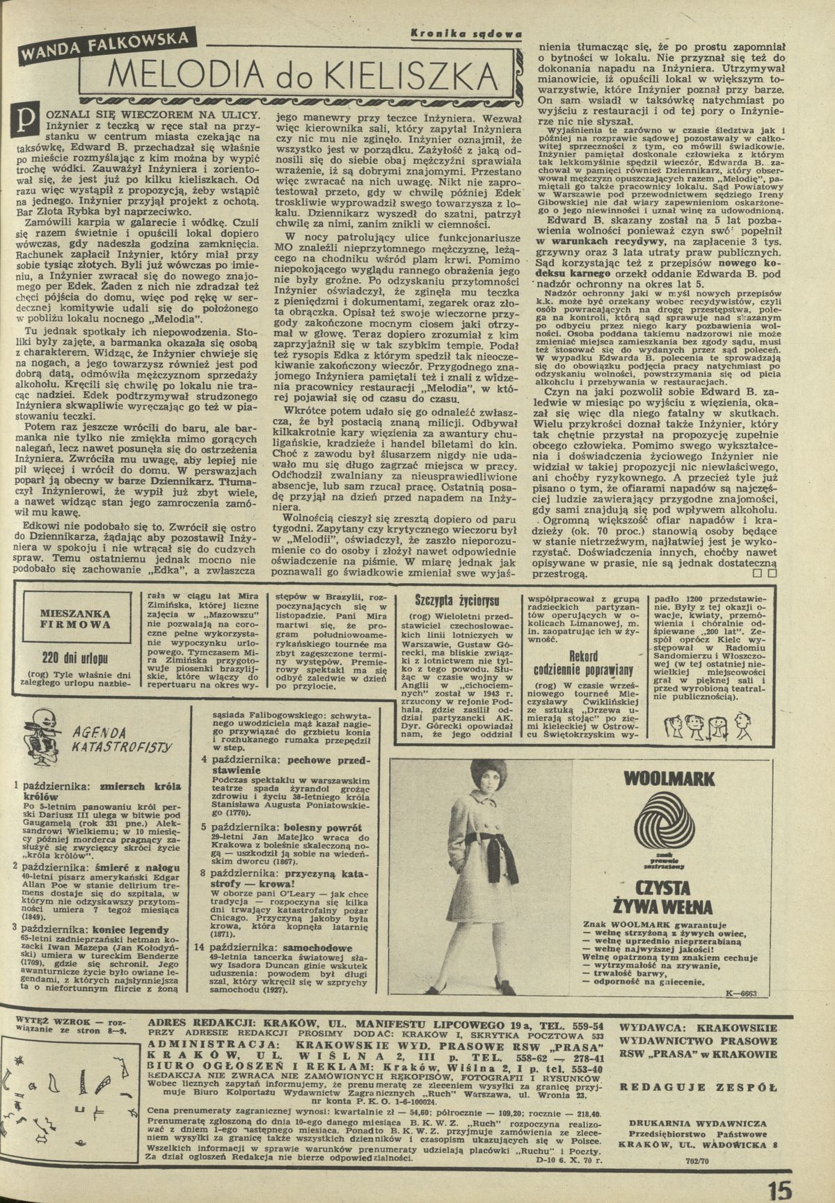 Archiwum / Kronika sądowa nr 1331 (41/1970) 567/881 Podziel się Tytuł Melodia do kieliszka Autor Wanda Falkowska Rubryka Kronika sądowa Artykuł z numeru 1331 (41/1970) Data wydania 11 października 1970