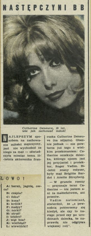 Archiwum / Rozrywka nr 939-40 (14-15/1963) 28/44 Podziel się Tytuł Następczyni BB Kategoria Rozrywka Artykuł z numeru 939-40 (14/1963) Data wydania 14 kwietnia 1963 Tagi Catherine Deneuve film aktorka