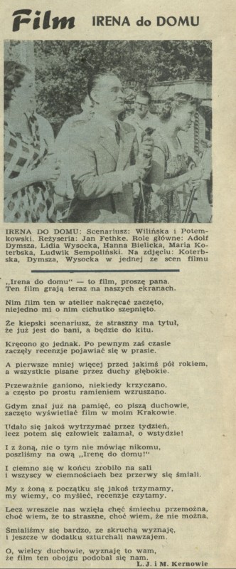 Archiwum / Film nr 558-59 (51-52/1955) 20/20 Podziel się Tytuł Irena do domu Autor Ludwik Jerzy Kern Rubryka Film Artykuł z numeru 558-59 (51/1955) Data wydania 24 grudnia 1955 Tagi Wilińska Potemkowski Fethke Dymsza Wysocka wiersz