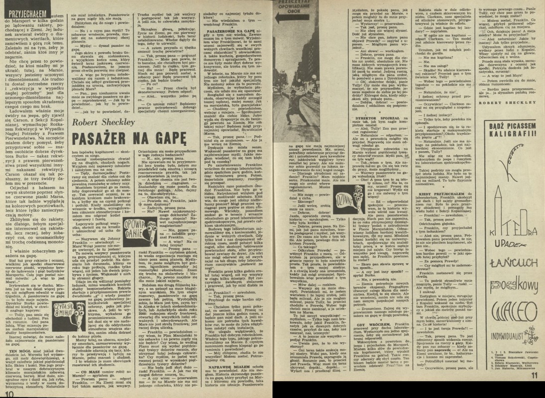 Archiwum / Opowiadanie nr 864 (44/1961) 85/238 Podziel się Tytuł Pasażer na gapę Autor Robert Sheekley Kategoria Opowiadanie Artykuł z numeru 864 (44/1961) Data wydania 29 października 1961 Tagi czyta sie 8 minut opowiadanie Marsport