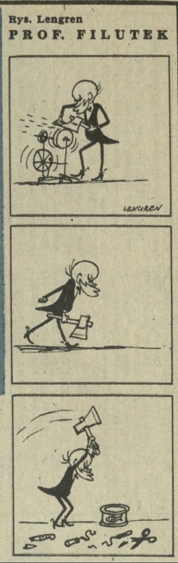 Archiwum / Profesor Filutek nr 621 (10/1957) 12/47 Podziel się Tytuł Prof. Filutek Autor Zbigniew Lengren Rubryka Profesor Filutek Artykuł z numeru 621 (10/1957) Data wydania 3 marca 1957 Tagi żart rysunkowy siekiera konserwa