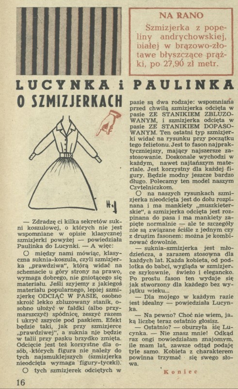 Archiwum / Dziś Lucynka i Paulinka nr 633 (22/1957) 24948/123969 Podziel się Tytuł Lucynka i Paulinka o szmizjerkach Autor Lucynka i Paulinka Rubryka Dziś Lucynka i Paulinka Artykuł z numeru 633 (22/1957) Data wydania 26 maja 1957 Tagi sukienka koszulowa