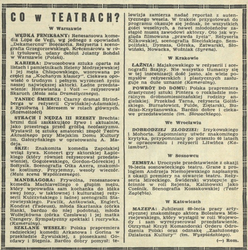 Archiwum / Teatr nr 1187 (01/1968) 02/27 Podziel się Tytuł Co w teatrach? Autor Rom. Rubryka Teatr Artykuł z numeru 1187 (1/1968) Data wydania 7 stycznia 1968 Tagi łaźnia madragora