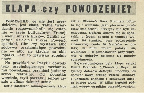 Archiwum / Kultura nr 1187 (01/1968) 19/95 Podziel się Tytuł Klapa czy powodzenie? Autor Top. Kategoria Kultura Artykuł z numeru 1187 (1/1968) Data wydania 7 stycznia 1968