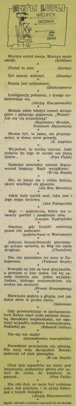 Archiwum / Myśli ludzi wielkich, średnich i psa Fafika nr 622 (11/1957) 87/87 Podziel się Tytuł Myśli ludzi wielkich i średnich oraz psa Fafika Autor Bracia Rojek Rubryka Myśli ludzi wielkich, średnich i psa Fafika Artykuł z numeru 622 (11/1957) Data wydania 10 marca 1956 Tagi cytaty aforyzmy
