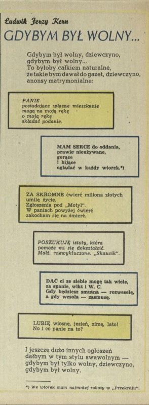 Archiwum / Rozmaitości [old] nr 622 (11/1957) 82/133 Podziel się Tytuł Gdybym był wolny... Autor Ludwik Jerzy Kern Rubryka Rozmaitości [old] Artykuł z numeru 622 (11/1957) Data wydania 10 marca 1956 Tagi wiersz ogłoszenia matrymonialne
