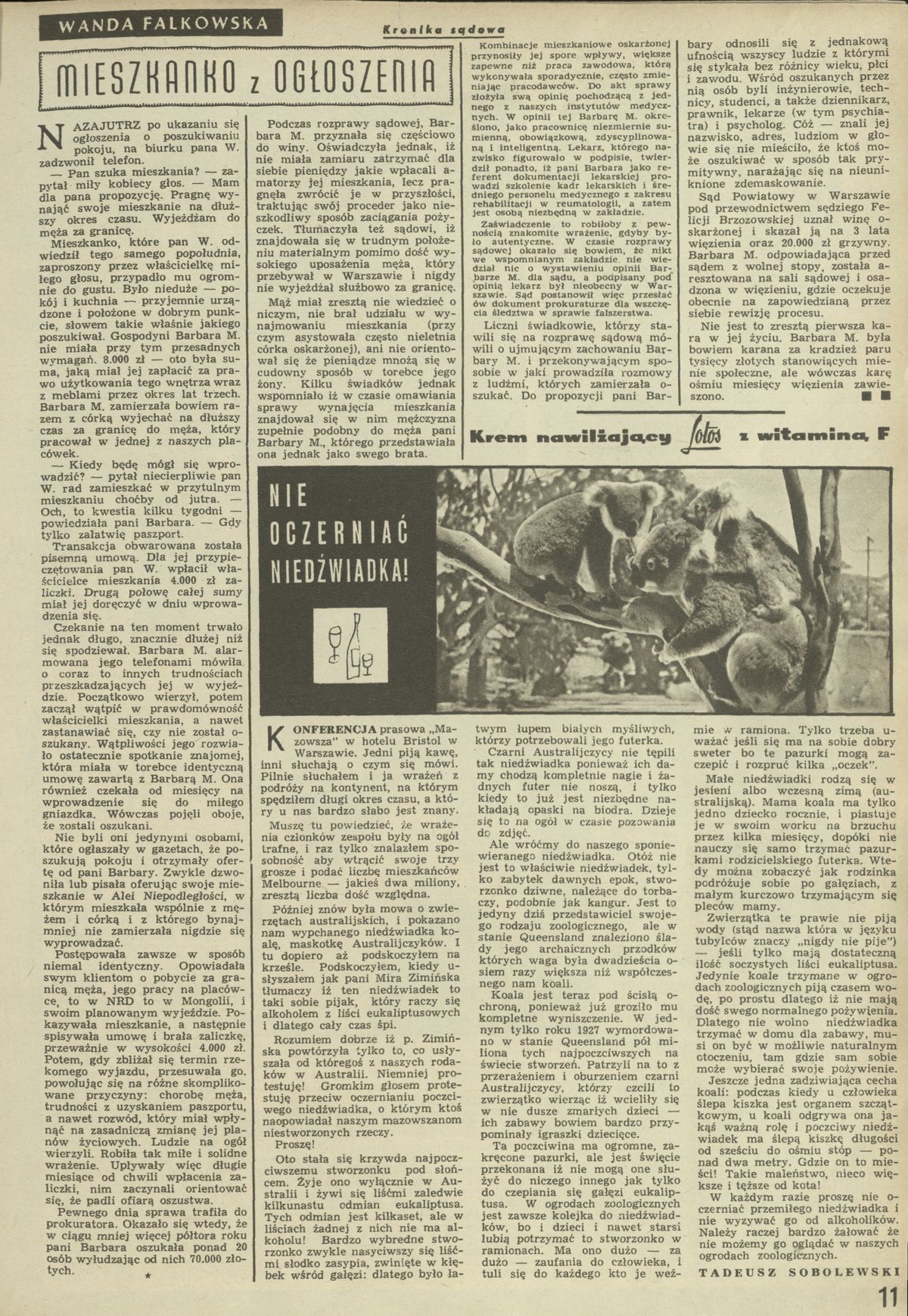 Archiwum / Kronika sądowa nr 1192 (06/1968) 440/881 Podziel się Tytuł Mieszkanko z ogłoszenia Autor Wanda Falkowska Rubryka Kronika sądowa Artykuł z numeru 1192 (6/1968) Data wydania 1 stycznia 1968