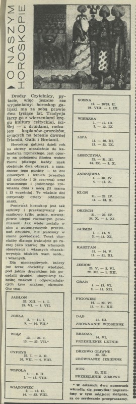 Archiwum / Rozrywka nr 1397 (03/1972) 56882/123969 Podziel się Tytuł O naszym horoskopie Kategoria Rozrywka Artykuł z numeru 1397 (3/1972) Data wydania 16 stycznia 1972 Tagi horoskop galijski drzewa