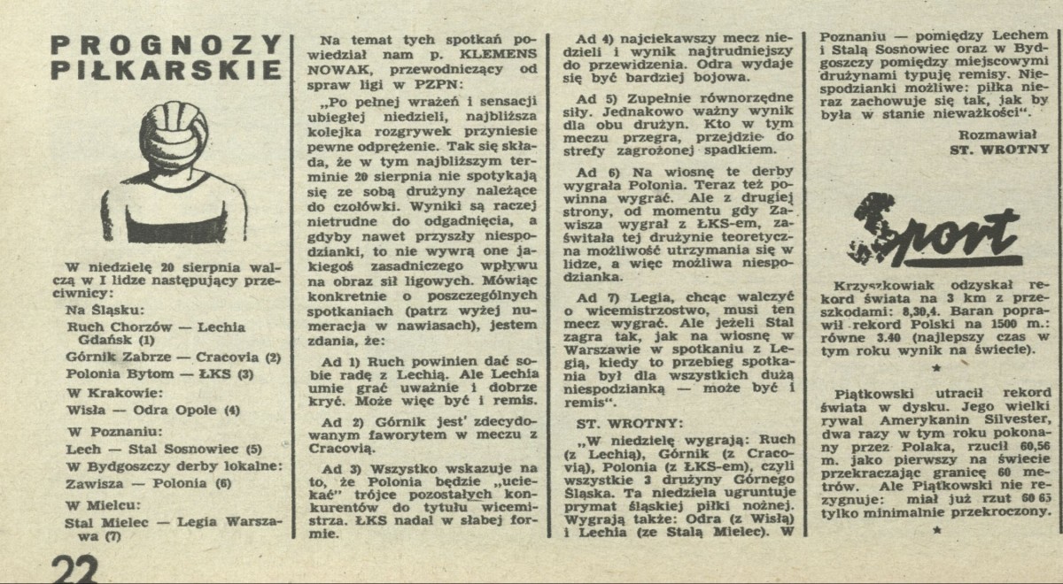 Archiwum / Sport nr 854 (34/1961) 35520/123969 Podziel się Tytuł Prognozy pilkarskie Autor Stanisław Wrotny Kategoria Sport Artykuł z numeru 854 (34/1961) Data wydania 20 sierpnia 1961 Tagi PZPN sport piłka nożna Ruch Górnik Cracovia