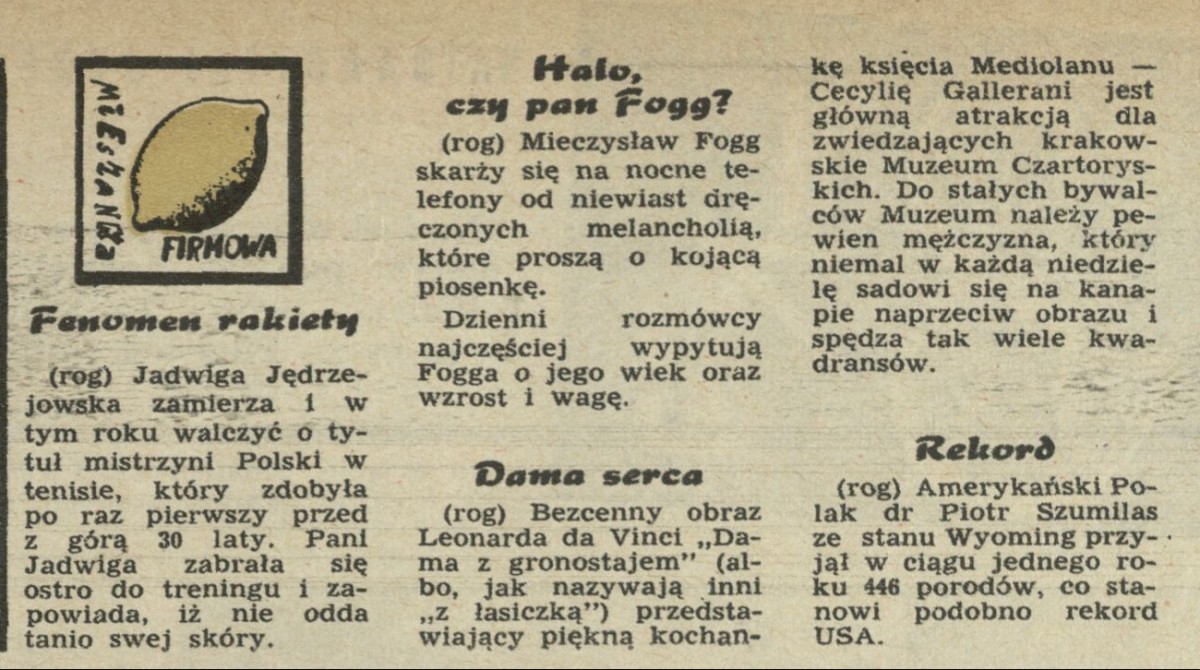 Archiwum / Mieszanka firmowa nr 945 (20/1963) 1/2 Podziel się Tytuł Mieszanka firmowa Rubryka Mieszanka firmowa Artykuł z numeru 945 (20/1963) Data wydania 19 maja 1963 Tagi Fogg rekord