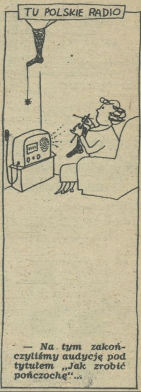 Archiwum / Historyjki obrazkowe nr 661 (50/1957) 24997/108863 Podziel się Tytuł Tu Polskie Radio Autor Marian Eile Kategoria Historyjki obrazkowe Artykuł z numeru 661 (50/1957) Data wydania 8 grudnia 1957 Tagi żart rysunkowy pończochy