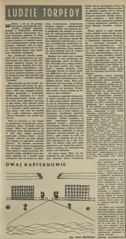 Archiwum / Artykuł nr 661 (50/1957) 7/7 Podziel się Tytuł Ludzie torpedy Autor Michał Kasprzycki Kategoria Artykuł Artykuł z numeru 661 (50/1957) Data wydania 8 grudnia 1957 Tagi "Valiant" Morgan wojna żywe torpedy Włochy ludzie-żaby