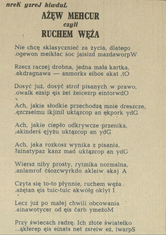 Archiwum / Rozmaitości [old] nr 722 (06/1959) 02/98 Podziel się Tytuł Ruchem węża Autor Ludwik Jerzy Kern Rubryka Rozmaitości [old] Artykuł z numeru 722 (6/1959) Data wydania 8 stycznia 1959