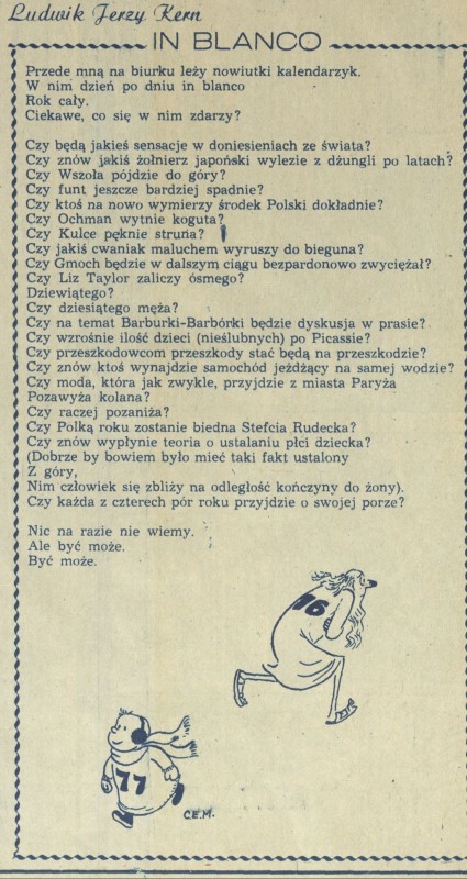 Archiwum / Rozmaitości [old] nr 1656 (01/1977) 02/97 Podziel się Tytuł In blanco Autor Ludwik Jerzy Kern Rubryka Rozmaitości [old] Artykuł z numeru 1656 (1/1977) Data wydania 2 stycznia 1977 Tagi wiersz 1976 1977 nowy rok