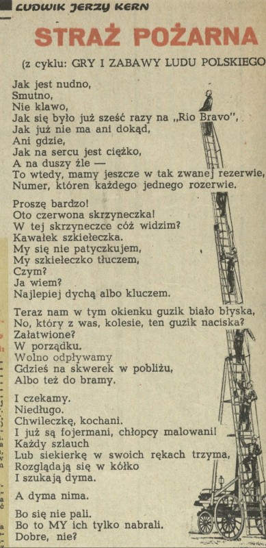 Archiwum / Poezja nr 945 (20/1963) 13/36 Podziel się Tytuł Straż pożarna Autor Ludwik Jerzy Kern Kategoria Poezja Artykuł z numeru 945 (20/1963) Data wydania 19 maja 1963 Tagi gry i zabawy