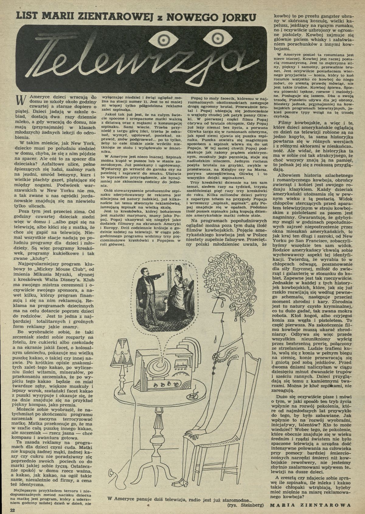 Archiwum / korespondencja własna "Przekroju" nr 620 (09/1957) 99665/123969 Podziel się Tytuł Telewizja Autor Maria Zientarowa Rubryka korespondencja własna "Przekroju" Artykuł z numeru 620 (9/1957) Data wydania 24 lutego 1957 Tagi Nowy Jork USA Ameryka program telewizyjny Walt Disney kreskówki bajki Popeye szpinak kowboj
