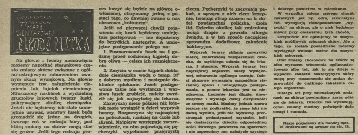 Archiwum / Pogadanka tygodniowa nr 416-17 (13-14/1953) 109190/123969 Podziel się Tytuł Młoda matka Autor Anna Zientarowa Rubryka Pogadanka tygodniowa Artykuł z numeru 416-17 (13/1953) Data wydania 24 marca 1953 Tagi macierzyństwo rodzice dziecko niemowlę wychowanie dzieci zmiany skórne wypryski