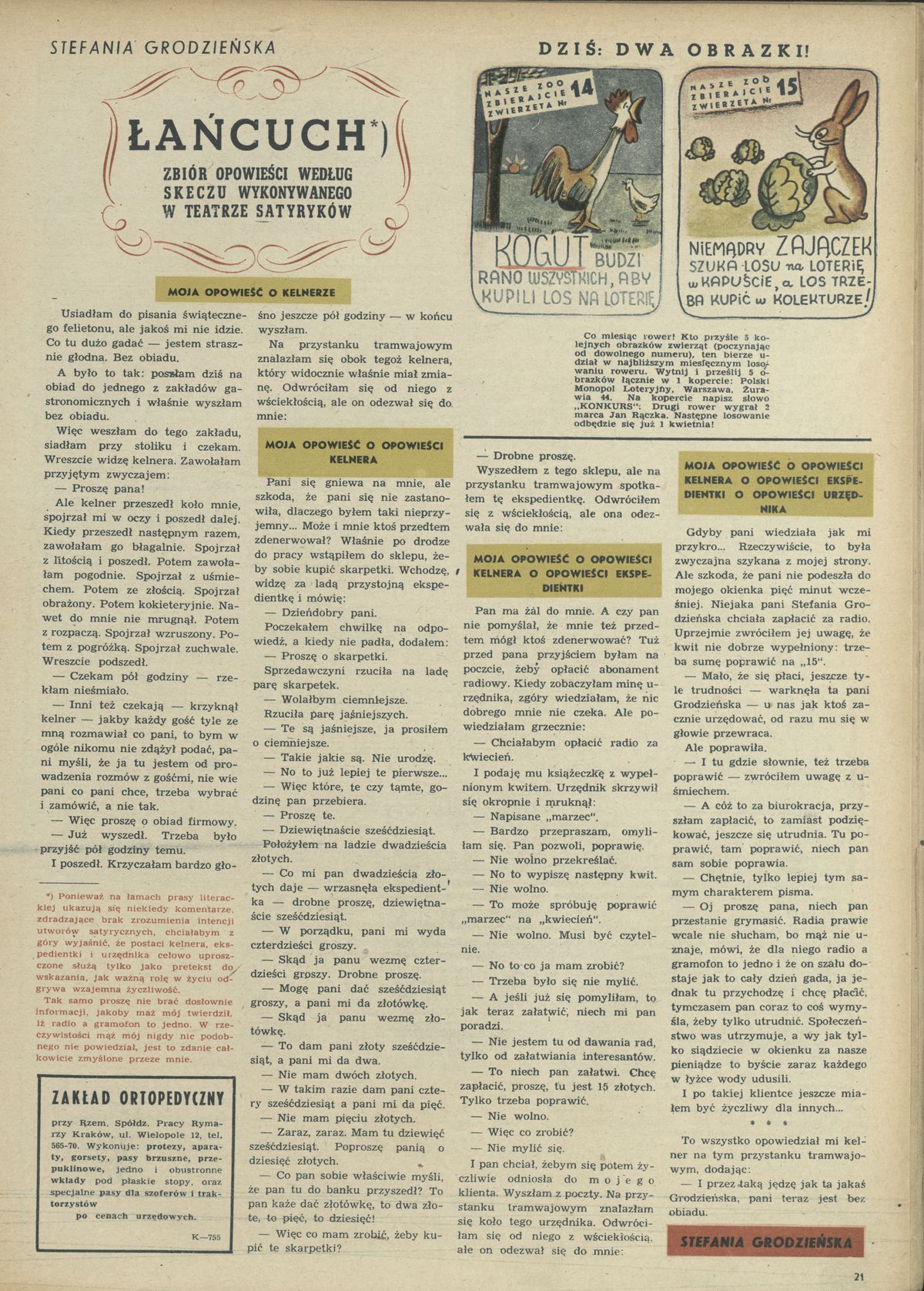 Archiwum / Felieton nr 416-17 (13-14/1953) 14779/123969 Podziel się Tytuł Łańcuch (zbiór opowieści według skeczu wykonywanego w Teatrze Satyryków) Autor Stefania Grodzieńska Kategoria Felieton Artykuł z numeru 416-17 (13/1953) Data wydania 24 marca 1953