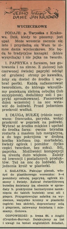 Archiwum / Jedno danie nr 1059 (30/1965) 03/10 Podziel się Tytuł Jedno danie wycieczkowe Autor Jan Kalkowski Rubryka Jedno danie Artykuł z numeru 1059 (30/1965) Data wydania 25 lipca 1965 Tagi gastronomia kulinaria przepis kulinarny papryka z farszem bułka bagietka sałatka