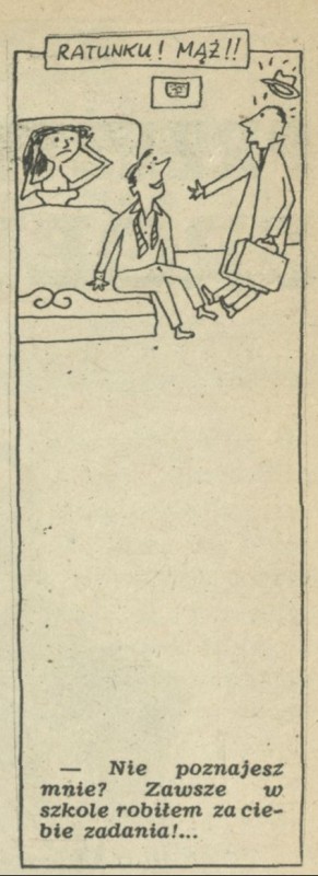 Archiwum / Historyjki obrazkowe nr 625 (14/1957) 06/44 Podziel się Tytuł Ratunku, mąż!! Autor Marian Eile Kategoria Historyjki obrazkowe Artykuł z numeru 625 (14/1957) Data wydania 31 marca 1957 Tagi żart rysunkowy szkoła praca domowa