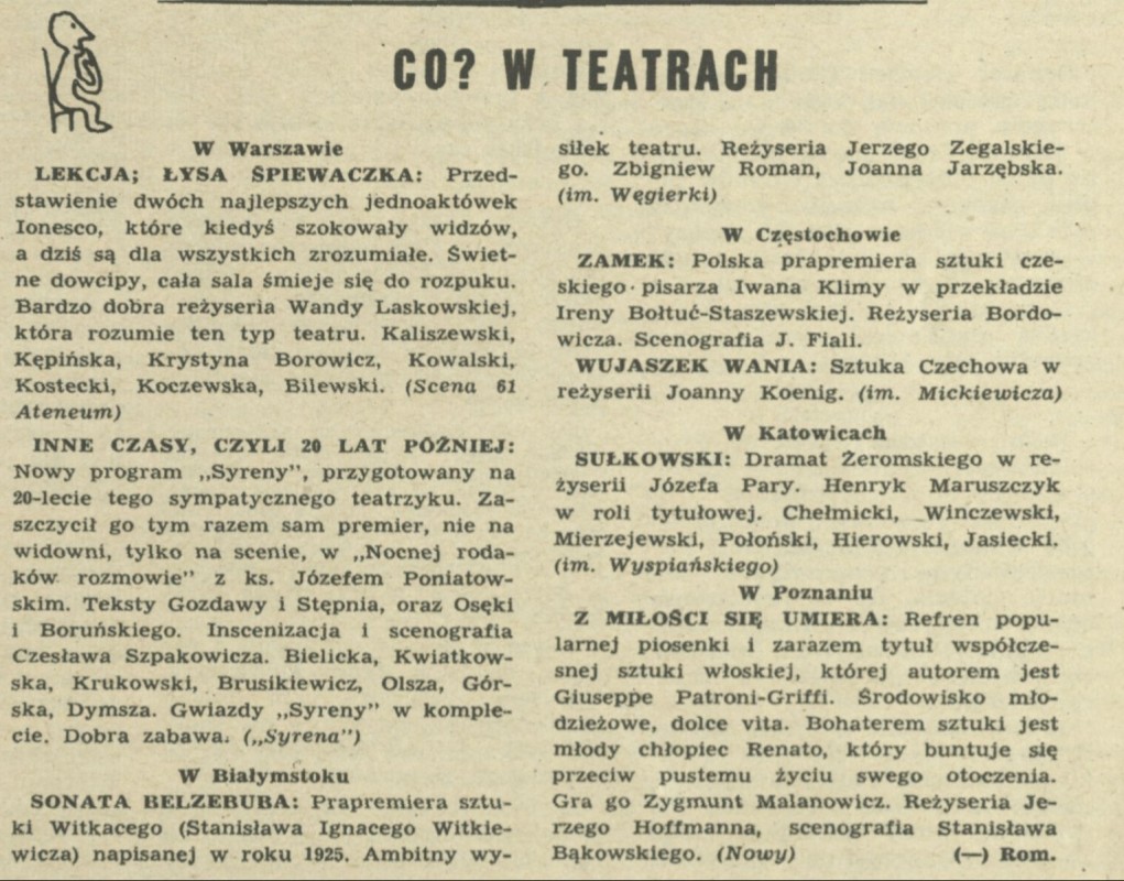 Archiwum / Teatr nr 1090 (09/1966) 750/1291 Podziel się Tytuł Co w teatrach Autor Rom. Rubryka Teatr Artykuł z numeru 1090 (9/1966) Data wydania 27 lutego 1966 Tagi "Łysa śpiewaczka" Warszawa "Wujaszek Wania" Częstochowa