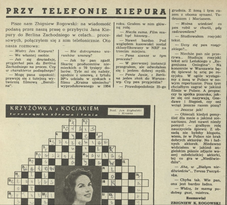 Archiwum / Rozmowy z artystami nr 764 (48/1959) 322/333 Podziel się Tytuł Przy telefonie Kiepura Autor Zbigniew K. Rogowski Rubryka Rozmowy z artystami Artykuł z numeru 764 (48/1959) Data wydania 29 listopada 1959 Tagi Jan Kiepura "Niedźwiedź" Teresa Tuszyńska
