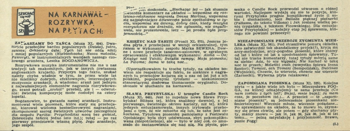 Archiwum / Słuchać albo nie słuchać nr 1343 (01/1971) 54772/123969 Podziel się Tytuł Na karnawał - rozrywka na płytach Autor L. Rubryka Słuchać albo nie słuchać Artykuł z numeru 1343 (1/1971) Data wydania 3 stycznia 1971 Tagi muzyka taniec Sława Przybylska Zygmunt Wiehler