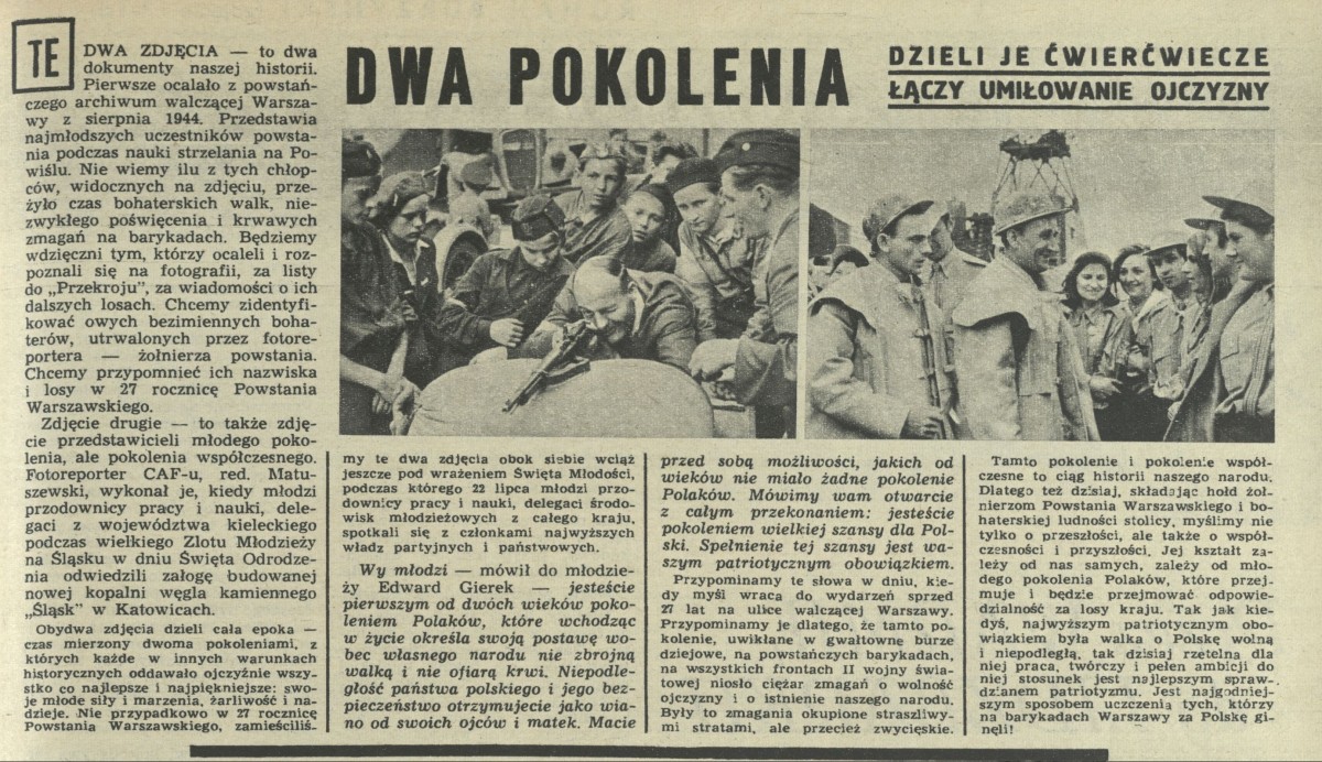 Archiwum / Artykuł nr 1373 (31/1971) 29/33 Podziel się Tytuł Dwa pokolenia Kategoria Artykuł Artykuł z numeru 1373 (31/1971) Data wydania 1 sierpnia 1971 Tagi ojczyzna Powstanie Warszawskie II wojna światowa